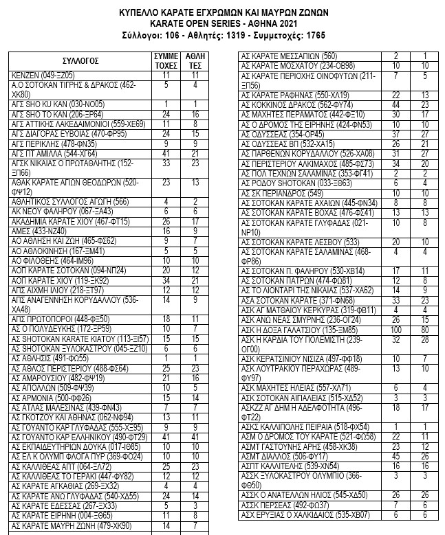 Οι συμμετοχές των αθλητών ταξινομημένες κατά πλήθος αθλητών των συλλόγων στους αγώνες: