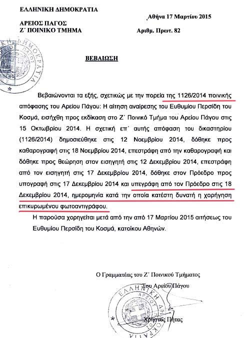 Για την Υπόθεση αυτή (ποινικό του Δρακόπουλου κατά Περσίδη) εκδόθηκε η επόμενη βεβαίωση του Αρείου Πάγου για τη δημοσίευσή της την 18/12/2014.
