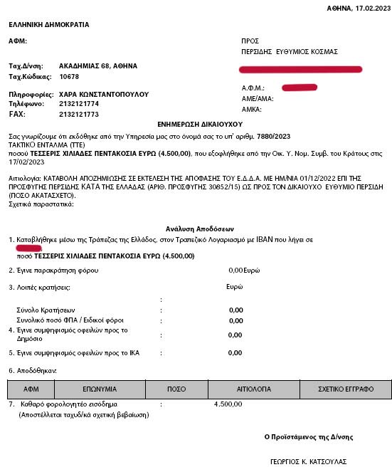 Πέρασαν εξίμισι χρόνια μέχρι να πάρω επιστολή για την εκδίκαση από το ΕΔΔΑ με δική του πρόταση αυτή τη φορά για παρόμοιο συμβιβασμό. Το δέχθηκα διότι όλα είχαν καθυστερήσει πολύ, ενώ ακόμα και αν δικαζόταν η υπόθεση θα μου άφηνε λιγότερα χρήματα μετά από τα επόμενα έξοδα!