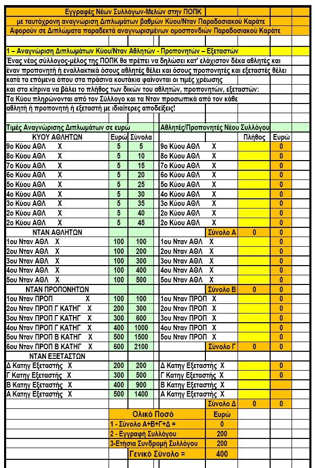 Για κάθε σύλλογο και κάθε σύνθεση αναγνώρισης διπλωμάτων και εγγραφής στην ΠΟΠΚ μπορεί να εφαρμοστεί το EXCEL, που μπορείτε να κατεβάσετε με κλικ εδώ, της επόμενης εικόνας, όπου αν στα κίτρινα κουτάκια βάλετε το δικό σας πλήθος αθλητών, προπονητών και εξεταστών, τότε θα προκύψει αυτόματα το Ολικό Κόστος Εγγραφής στην ΠΟΠΚ. Μπορείτε να συμπληρώσετε το EXCEL για τον δικό σας σύλλογο.