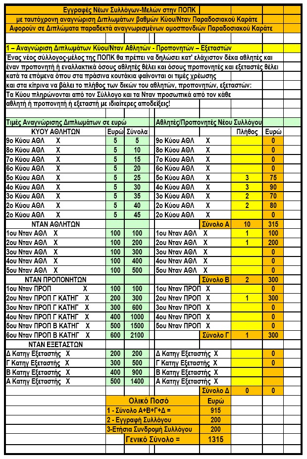 Στην επόμενη εικόνα βλέπετε τη συνολική χρέωση για να εγγραφεί ένας σύλλογος ως μέλος της ΠΟΠΚ με 32 αθλητές με αντίστοιχα Κύου, 13 αθλητές με αντίστοιχα Νταν, δύο προπονητές με 2ο και 4ο Νταν, και δύο εξεταστές Δ και Γ κατηγορίας.