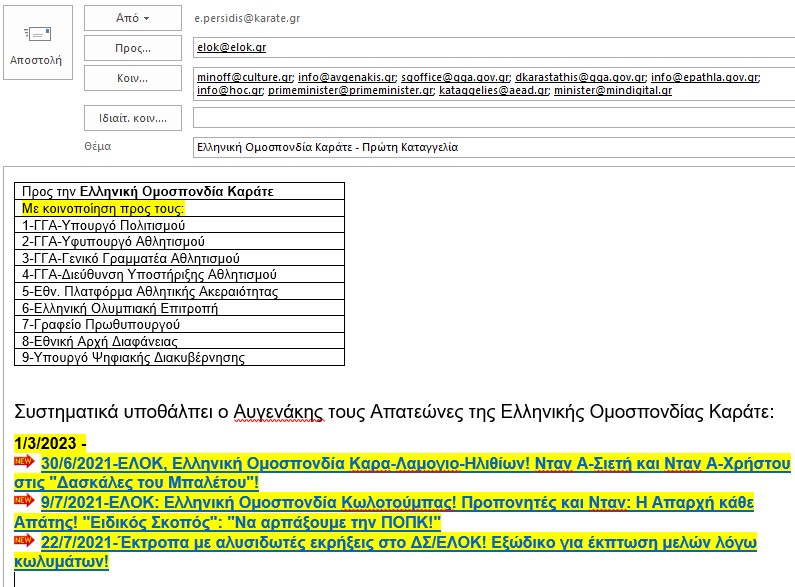 11) επειδή κατά τον τελευταίο ενάμιση χρόνο και συγκεκριμένα από την ενασχόληση μου με τα κοινά της ΕΛ.Ο.Κ και ένθεν, έχω δεχθεί απίστευτες επιθέσεις (υπό μορφή λεκτικής βίας στηριζόμενη σε ψεύδη, ύβρεις, συκοφαντίες, περιπαικτικά σχόλια κατά εμού) απο συγκεκριμένα άτομα που λαμβάνουν χώρα, στο διαδίκτυο μέσω συγκεκριμένων σελίδων ή μέσω αληθινών ή ψευδών προφίλ στο Facebook ακόμα, ακόμα και απειλών με στόχο τους, τον εκφοβισμό μου, καθώς και την διαπόμπευση μου έναντι των μελών της Ομοσπονδίας προκειμένου να βληθεί η αξιοπιστία των λεγόμενων μου καθώς και η προσωπικότητα μου. Τα ανωτέρω είναι ήδη σε γνώση σας απο γραπτή καταγγελία μου προς την ΕΛ.Ο.Κ από τότε που ήσασταν αναπληρωτής πρόεδρος της Π.Δ της ΕΛ.Ο.Κ έως και σήμερα που είστε Πρόεδρος του Δ.Σ της ΕΛ.Ο.Κ και ουδέν πράξατε, προκειμένου να προστατεύσετε τόσο εμένα όσο και τον χώρο από την ανηλεή συκοφαντική δυσφήμηση που δεχόταν από συγκεκριμένη μερίδα ατόμων που είναι φίλα προσκείμενη προς εσάς
