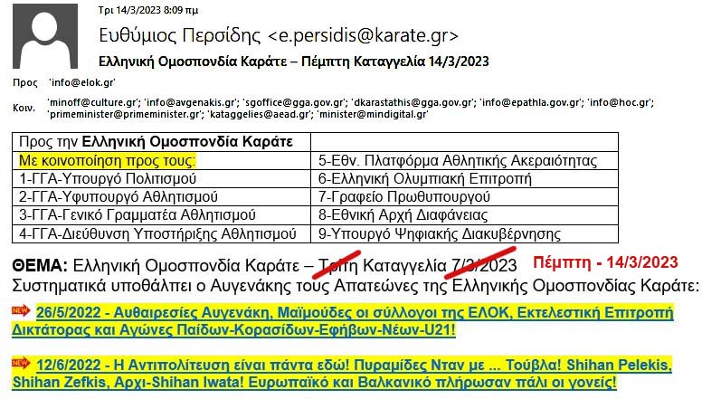 | 50 | Όταν το 2014 και κατά την εξέλιξη της Σχολής Προπονητών Καράτε "βομβάρδιζα" τα Υπουργεία με emails (κλικ εδώ) για τις παρανομίες του Γερόλυμπου σε τρεις αθλητικές ομοσπονδίες και την αδιαφορία της ΓΓΑ για αυτές τις παρανομίες (τα emails έφθαναν και στα χέρια του σημερινού Πρωθυπουργού!), η τότε κυβέρνηση του Αντώνη Σαμαρά έδωσε εντολή στον Υφυπουργό Αθλητισμού Γιάννη Ανδριανό να "καθαρίσει" τις ομοσπονδίες-μαϊμούδες με αποτέλεσμα μετά από ενδελεχείς έρευνες να αφαιρεθεί η ειδική αθλητική αναγνώριση από εννέα ομοσπονδίες (κλικ εδώ)! Αυτό δεν είχε γίνει ποτέ πριν και δεν έγινε ποτέ μετά, αλλά έγινε μόνο μια φορά στο τέλος του 2014 και αιτία ήταν οι έρευνες και δημοσιεύσεις του www.karate.gr! |