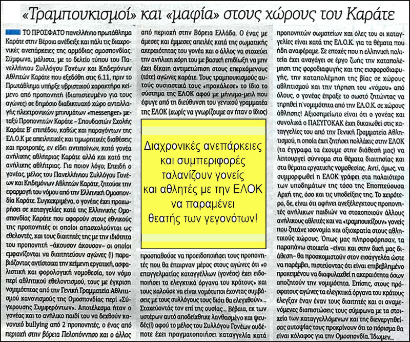Διαμαρτυρία του Συλλόγου Γονέων Αθλητών Καράτε για το σοβαρό τραυματισμό αθλήτριας σε Βαλκανικό Πρωτάθλημα