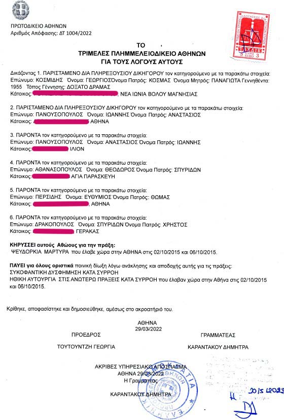 Και τελικά το Δικαστήριο ανακοίνωσε την Απόφασή του, που ήταν ίδια με την πρόταση της κας Εισαγγελέως με την πρόσθετη παρατήρηση ότι η μνήμη του μάρτυρα Χονδροματίδη ήταν πιο φρέσκια και αξιόπιστη κατά την ένορκη βεβαίωση την 18/2/2015 παρά κατά την κατάθεσή του στην Πρώτη Δίκη την 22/10/2021! Και η Απόφαση είναι η επόμενη σε απόσπασμα: