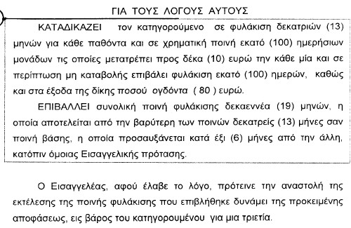 Θα παρατηρήσουμε ότι το "Έγκλημα" υπερτιμάται ή υποβαθμίζεται αλλοπρόσαλλα και η "Τιμωρία" δεν ακολουθεί καμιά αναλογικότητα! Το Σύστημα απόδοσης δικαιοσύνης θέλει κάποιες ρυθμίσεις, θα λέγαμε!