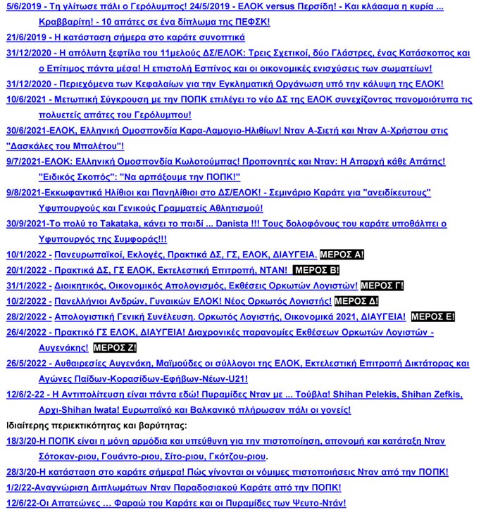 Πυραμίδες Νταν με ... Τούβλα! Οι Shihan του Shitoryu! Ανασυντάσσεται το Shotokan! Οι Συμμορίες χειραγώγησης της ΕΛΟΚ! Επιτροπές και Πειθαρχικό. Σχολή Προπονητών και Παρανομίες ΕΛΟΚ!