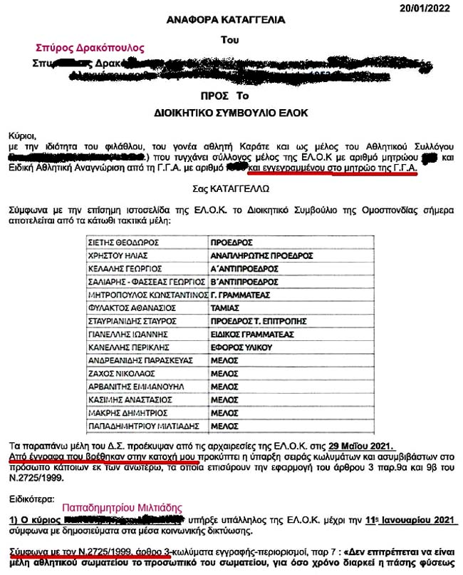 Κατόπιν τούτου είμαι υποχρεωμένος όπως αναφέρω - καταγγείλω τα κάτωθι στην εποπτεύουσα αρχή της ΕΛ.Ο.Κ, την Γ.Γ.Α και σε κάθε άλλη αρμόδια αρχή για την ως άνω απαράδεκτη πρακτική διότι η ΕΛ.Ο.Κ είναι υποχρεωμένη εκ του νόμου να δίνει αριθμό πρωτοκόλλου σε κάθε εισερχόμενο έγγραφο που λαμβάνει και να το παραδίδει άμεσα είτε εις χείρας είτε με αποστολή ηλεκτρονικού ταχυδρομείου στον αποστολέα του εγγράφου χωρίς να απαιτείται ειδική άδεια από εκτελεστικά μέλη του Δ.Σ της ΕΛ.Ο.Κ και συγκεκριμένα του Γ.Γ της ΕΛ.Ο.Κ.