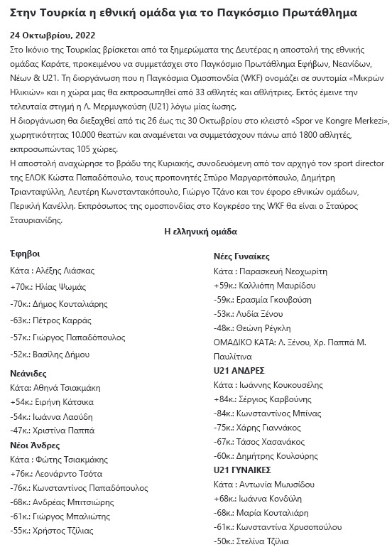 Την 24η/10/2022 ανακοίνωσε η ΕΛΟΚ την τελική εθνική ομάδα, που θα πάρει μέρος στους παγκόσμιους Εφήβων, Νέων, U21 στο Ικόνιο με την επόμενη ανακοίνωση: