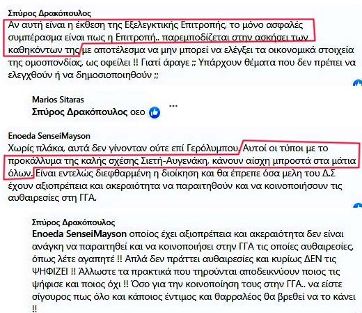 Διώξανε τον Γερόλυμπο οι σημερινοί ... "Εξυγιαντές", αλλά κράτησαν όλες του τις αρπακτικές συνήθειες και μάλιστα πρόσθεσαν σε αυτές και τις δικές τους με αποτέλεσμα: Στα δύο χρόνια, που πέρασαν, κατάφεραν να "θεσπίσουν" ως ικανοποιητικό έλεγχο το άλλοθι της Έκθεσης των Ορκωτών Λογιστών, οι οποίοι δεν είναι τίποτα άλλο παρά ο "λογιστής της γειτονιάς"! Για το 2021 δεν υπήρχε καν Τριμελής Ελεγκτική Επιτροπή, αλλά μόνο μια δήθεν Έκθεση-κουκούλωμα "του Ενός Σταυροπιερράκου"! Για το 2022, δηλαδή σήμερα, οι Αναπληρωματικοί των εκλογών για την Ελεγκτική Επιτροπή αξαπατώνται εξόφθαλμα από την Εκτελεστική Επιτροπή με αποφάσεις περί πρόσληψης Ορκωτού Λογιστή και άλλες μεθοδευμένες προσπάθειες απόκρυψης για να κλείσουν στόματα!