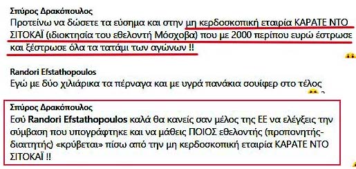 Από την άλλη μεριά ο Γιάννης Μοσχόβας είναι προπονητής του "448 - Αθλητικού Πολιτιστικού Συλλόγου Πρωτοπόροι", που παίρνει 260 € στον ανωτέρω πίνακα, και ταυτόχρονα διαιτητής της ΕΛΟΚ και ταυτόχρονα Διευθυντής της μη κερδοσκοπικής εταιρείας "Ελληνικό Καράτε Σιτοκάι" με έδρα στο σπίτι του, η οποία χωρίς να δηλώνει κανένα άτομο ως προσωπικό, παρ' όλα αυτά αναλαμβάνει να στρώσει και να ξεστρώσει όλα τα έξι τατάμι (περί τα 450?) των έξι αγωνιστικών χώρων των διεθνών αγώνων Καράτε Κ1 και να πληρώνεται για αυτή τη δουλειά με 2000 € κατά πληροφορίες!!! Εδώ γίνονται ... 10-20 διοικητικές, φορολογικές και εισφορολογικές παραβάσεις από το Μοσχόβα, τους "εθελοντές" που χρησιμοποίησε (δηλ. τα κορόιδα-μαθητές του, που έστρωσαν-ξέστρωσαν τα τατάμι και τα λεφτά τα πήρε ο ίδιος) (!), από την ΕΛΟΚ, από τον Πρόεδρο της ΕΛΟΚ, από τον Ταμία οικονομολόγο Θανάση Φυλακτό, ακόμα και από τη ... Μαρία την Πενταγιώτισσα!!!