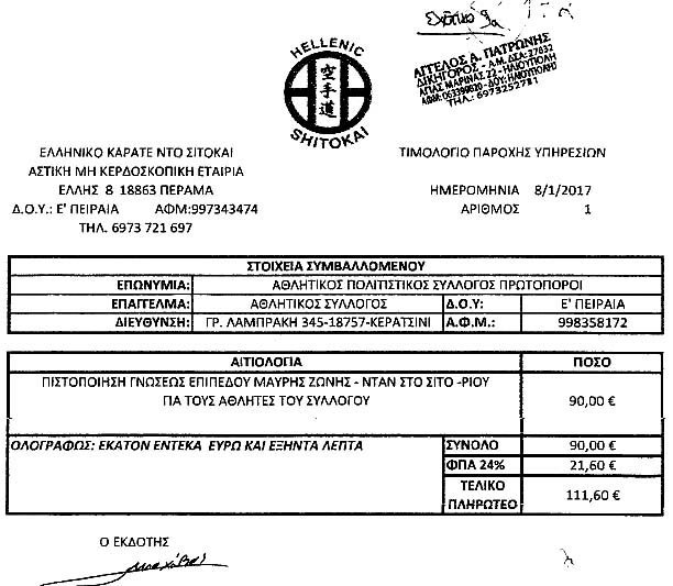 ... στο οποίο παρατηρούμε ότι ο Γιάννης Μοσχόβας ως μη κερδοσκοπική εταιρεία "Ελληνικό Καράτε Σιτοκάι" "πουλάει υπηρεσίες εξετάσεων και πιστοποίησης Νταν" στους αθλητές του συλλόγου ΠΡΩΤΟΠΟΡΟΙ, στον οποίο είναι προπονητής! Φυσικά ένα αντίστοιχο τιμολόγιο θα έχει κόψει και για το στρώσιμο-ξεστρώσιμο των έξι τατάμι προς την ΕΛΟΚ, στην οποία είναι "εθελοντής διαιτητής!!! Μπορεί, όμως, εθελοντής διαιτητής να πληρώνεται τον εθελοντισμό του μέσω ενίσχυσης του συλλόγου του και ταυτόχρονα να προσφέρει ως παροχή υπηρεσιών το στρώσιμο των τατάμι στην ΕΛΟΚ (εργασία καθαρά χειρονακτική από εργάτες) κόβοντας τιμολόγιο από αυτά των εξετάσεων μαύρων ζωνών σε αθλητές συλλόγων καράτε?