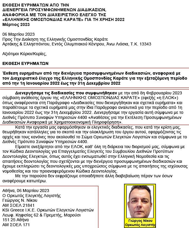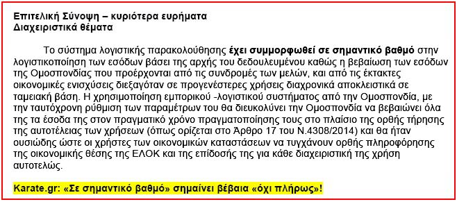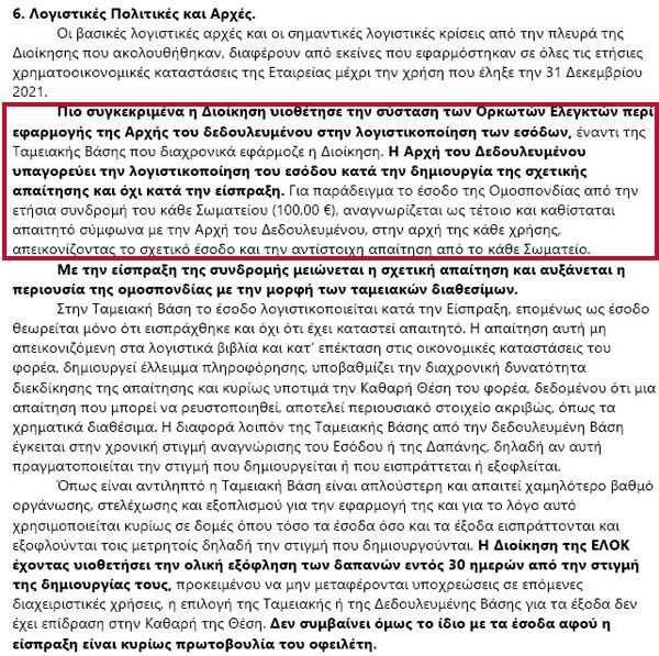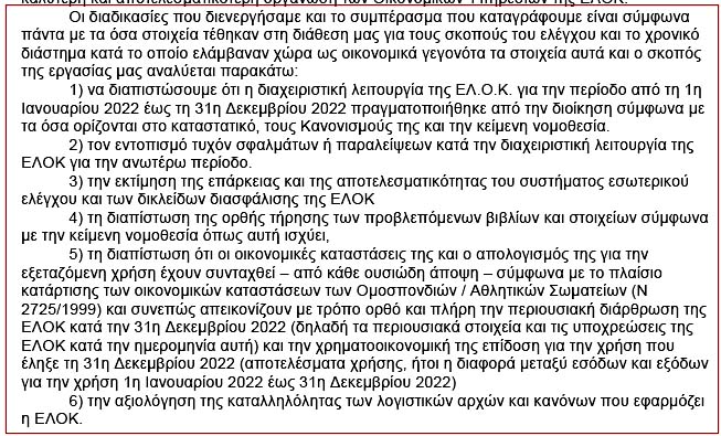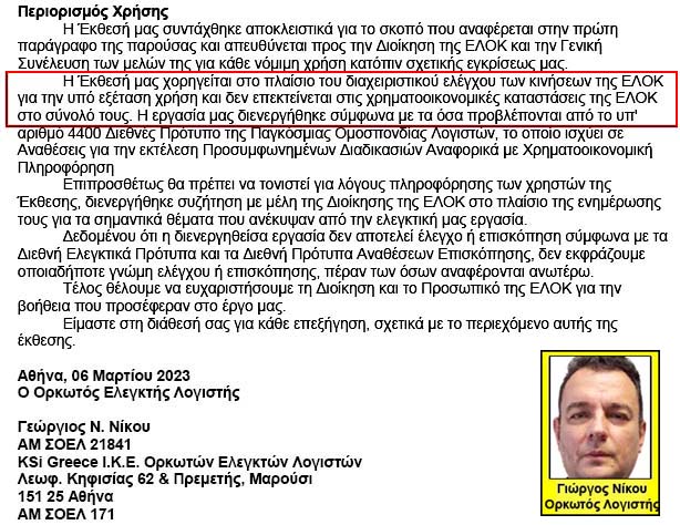 Εδώ σαφέστατα, ο Ορκωτός, αποποιείται της ευθύνης των οικονομικών καταστάσεων, πράγμα που καθιστά την Έκθεσή του τελείως άχρηστη για την επικύρωσή της από τη Γενική Συνέλευση και την απαλλαγή του ΔΣ από πάσης ευθύνης!!! Συνεπώς, ο Διαχειριστικός και Οικονομικός Έλεγχος της ΕΛΟΚ παραμένει αίολος, απόλυτα αστήρικτος και αθεμελίωτος!