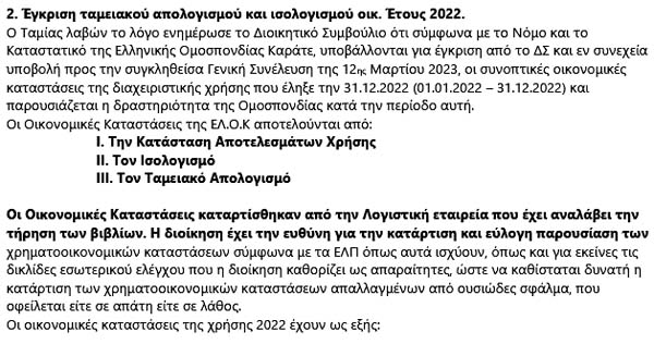 Όπως γίνεται φανερό εκ των ανωτέρω, στις 399.000 € των εσόδων της ΕΟΔΙ-ΞΕ.ΒΡΩ.ΧΡΗ. για το 2022, το άθροισμα των παράνομων εισπράξεών της είναι 30.000 + 16.000 + 50.000 + 11.000 + 71.000 + 70.000 = 248.000 € και αποτελούν οικονομικές απάτες του επόμενου ΔΣ/ΕΛΟΚ και η ΕΛΟΚ εισπράττει χρήματα με καραμπινάτες ψευδείς αιτιολογίες στα παραστατικά της: