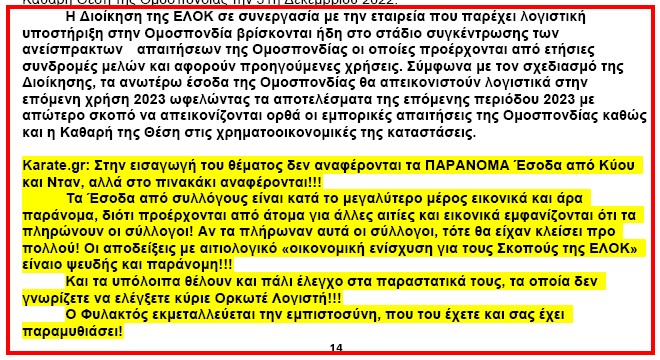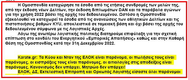 1.4 - Οι εξετάσεις Νταν των 30.000 € αποτελούν καραμπινάτη παρανομία της ΕΛΟΚ, διότι κατά ΠΡΩΤΟΝ με αυτές τις εξετάσεις και μόνο έχει εκτραπεί από το Σκοπό της και θα πρέπει να της αφαιρεθεί η Ειδική Αθλητική Αναγνώριση, διότι εξαπατούν τον κόσμο εκδίδοντας άχρηστα Νταν σε κωλόχαρτα μόνο και μόνο με πληρωμή χωρίς εξετάσεις! Κατά ΔΕΥΤΕΡΟΝ έχουμε και δεύτερη καραμπινάτη παρανομία, διότι εξετάσεις και αποτελέσματα πρέπει να γίνονται μετά από τις αντίστοιχες αποφάσεις του ΔΣ πράγμα που δεν γίνεται ΠΟΤΕ! Κατά ΤΡΙΤΟΝ, τα διπλώματα είναι απόλυτα προσωπικά και θα πρέπει να κόβονται αποδείξεις στο όνομα του κάθε εξεταζόμενου και νέου κατόχου Νταν με τα στοιχεία του και τον λόγο της παροχής υπηρεσιών και οπωσδήποτε ποτέ δεν χρεώνονται τα σωματεία!! Πώς εισπράττει τα λεφτά ο Μαφιόζος Ταμίας Θανάσης Φυλακτός??? Το πιθανότερο κατά ΤΕΤΑΡΤΟΝ είναι να τα εισπράττει με αποδείξεις στο όνομα συλλόγων και όχι ατόμων και με αιτιολογικό "οικονομική ενίσχυση για τους σκοπούς της ομοσπονδίας", πράγμα που σημαίνει ότι πάει σούμπιτος ΚΟΡΥΔΑΛΛΟ!!!