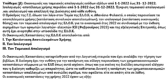 "Αφού ο Ταμίας της Ομοσπονδίας απάντησε σε ερωτήσεις αντιπροσώπων, ο Πρόεδρος της Γ.Σ. ζήτησε από το σώμα την έγκριση του ταμειακού απολογισμού, ισολογισμού- αποτέλεσμα χρήσης από 1-1-2022 έως 31-12-2022, και την απαλλαγή της Διοίκησης και των Ελεγκτών από κάθε ευθύνη για πράξεις ή παραλείψεις που συνέχονται με τον οικονομικό και ταμειακό απολογισμό εσόδων – εξόδων, καλώντας τα μέλη να τοποθετηθούν εάν διαφωνούν δηλώνοντας το όνομά τους δια της εφαρμογής της «παλάμης» που προσφέρει η πλατφόρμα. Αφού κανείς από τους εκπροσώπους δεν τοποθετήθηκε στη συνέχεια προχώρησε τη διαδικασία της ψηφοφορίας."