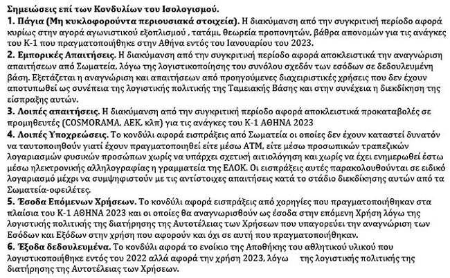 "Ο Ταμίας της Ομοσπονδίας πρότεινε να γίνουν δεκτές οι καταστάσεις του Δ.Σ. η έκθεση των ορκωτών λογιστών και η Έκθεση της Εξελεγκτικής Επιτροπής, όπως αυτές παρουσιάστηκαν στην Γενική Συνέλευση και βρίσκονται αναρτημένες στο site της Ομοσπονδίας."