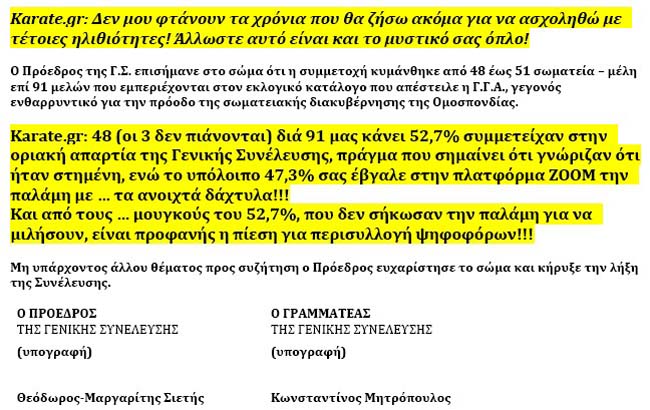 Για να μη μακρυγορούμε, με τον ίδιο τρόπο έγιναν και οι υπόλοιπες ψηφοφορίες με άμεσο αποτέλεσμα η Γενική Συνέλευση να είναι ΑΚΥΡΗ!!!