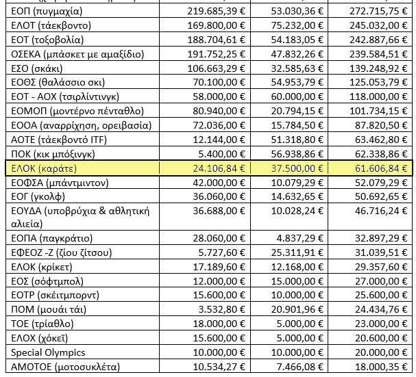 ενώ για 1η φορά επιχορηγούνται και οι τέσσερις νεοσύστατες Ομοσπονδίες (τρίαθλο, ράγκμπι, διελκυστίνδα, Special Olympics).