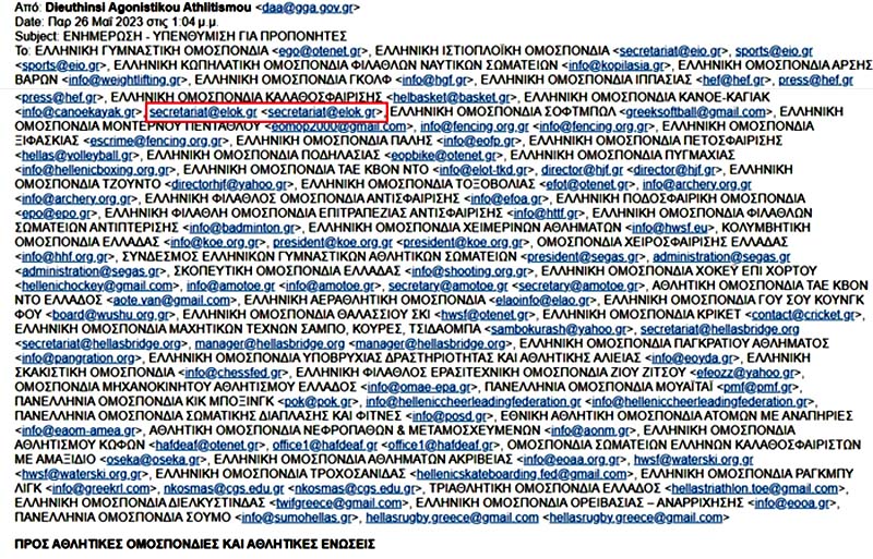 Από την 1/3/2023 καταγγέλθηκαν αναδρομικά από την 29/5/2021 όλες οι παρανομίες του Διοικητικού Συμβουλίου της ΕΛΟΚ σε όλες τις αρμόδιες υπηρεσίες με emails, ώστε να μην λένε ότι δεν ξέρουν! Οι καταγγγελίες θα επαναληφθούν μετά την ανάληψη των υπουργείων από τη νέα κυβέρνηση! |