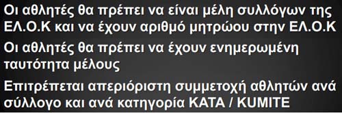 4 - Η διοργάνωση καλύπτεται από τη δικτυακή πλατφόρμα της Sportdata, η οποία όμως έχει σύμβαση μόνο με την ΕΛΟΚ (και όχι με τους διοργανωτές συλλόγους) και πληρώνεται μόνο από την ΕΛΟΚ, η οποία περνάει αυτές τις πληρωμές στα έξοδά της, όπως και όλα τα μετάλλια, ενώ όλες οι εισπράξεις των συμμετοχών των αθλητών πάνε με αλχημίες του Ταμία Θανάση Φυλακτού στους διοργανωτές συλλόγους του ομοσπονδιακού προπονητή Σπύρου Μαργαριτόπουλου και του Γενικού Γραμματέα της ΕΛΟΚ Κώστα Μητρόπουλου!