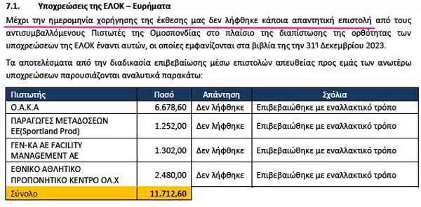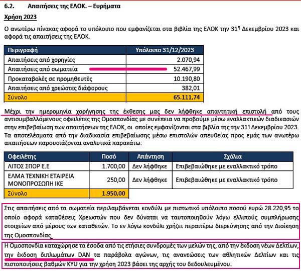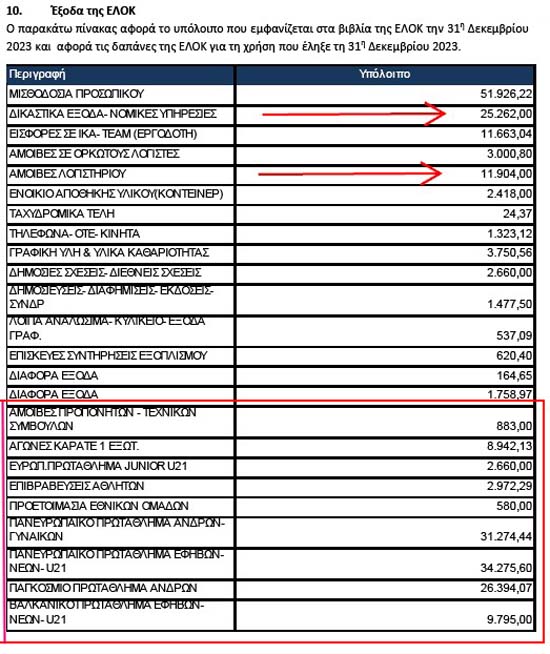 3. Η Διοίκηση της ΕΛ.Ο.Κ σύμφωνα με τον αναμορφωμένο προϋπολογισμό του 2023 στο τέλος του 2023, τις νομικές υπηρεσίες και τα δικαστικά έξοδα τα εκτόξευσε στις 25.000 ευρώ και για το 2024 στις 25.000 ευρώ με ορίζοντα τις 35.000 ευρώ και βλέπουμε…σύμφωνα πάντα με το πλήθος των υποθέσεων που την απασχολούν και θα την απασχολήσουν!
