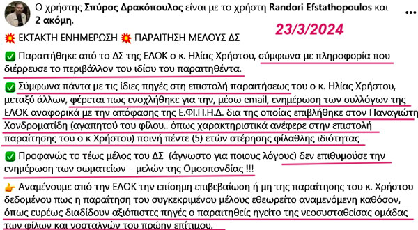 Ενδεικτικά δίνουμε και μια πρόσφατη ανάρτηση του Μάριου Σιταρά σχετική με τον Δρακόπουλο και τις περίεργες παραιτήσεις τεσσάρων μελών του ΔΣ της ΕΛΟΚ στις οποίες πάντα προστίθενται και οι παραιτήσεις όλων των εκλεγμένων μελών της Ελεγκτικής Επιτροπής, που άφησαν τους Τρεις Μαφιόζους απειλητικά ... ξεβράκωτους!!!: