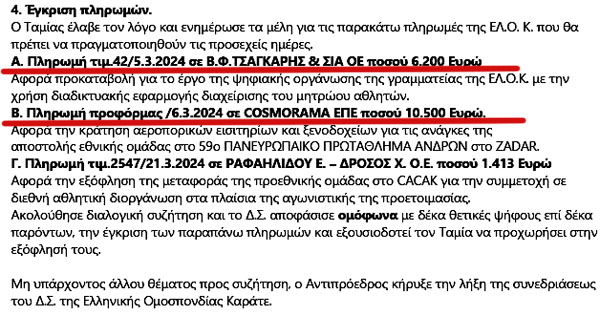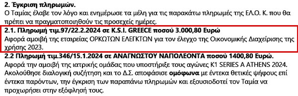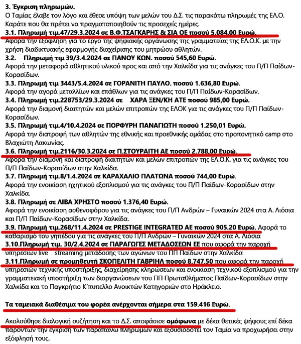 Στον Τσαγκάρη λεφτά χωρίς να δούμε προέγκριση και προσφορές! Και όλα πληρώνονται από το Ταμείο της ΕΛΟΚ, που κρατάει ο Φυλακτός στο γραφείο του!!! 2.788 € στον Στουραΐτη για διαμονή και φαγητά! Δεν μας γράφει το ποσό που πληρώθηκε στις ΠΑΡΑΓΩΓΕΣ ΜΕΤΑΔΟΣΕΩΝ! Πώς παίρνει έγκριση χωρίς το ποσό? Ο Σκοπελίτης παίρνει τεράστια ποσά το χρόνο! Στο παρελθόν είχε αγοραστεί πρόγραμμα διαχείρησης των αγώνων πολύ πιο φθηνό και ο Γερόλυμπος πήγε στην Sportdata για να βγάζει και ο ίδιος! Το ίδιο γίνεται και τώρα???