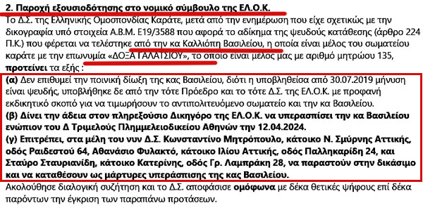 6. Από το 2021 και ένθεν η παρούσα διοίκηση της ΕΛ.Ο.Κ και μέλη αυτής έχουν προβεί στην υποβολή 4 μηνύσεων και 11 αγωγών κατα εμού και της συζύγου μου και στην σκύλευση του ονόματος μου, της Οικογένειας μου και της Εταιρίας της συζύγου μου μέσω παραπληροφόρησης (αποστολή ψεύδους περιεχομένου mail προς τους συλλόγους στο οποίο αναγράφουν και αναφέρουν εμένα ως καταγγέλοντα κατά των προπονητών των συλλόγων που αφορά το καθεστώς ασφάλισης του). Καθώς και δημοσιοποίησαν στην ΔΙΑΥΓΕΙΑ κείμενο μήνυσής τους κατά ημών με τα προσωπικά δεδομένα μας! Και όλα αυτά γιατί θεωρούν ότι ασκώ «αντιπολίτευση»… Σημειωτέον η σύζυγος μου μέσω της εταιρίας της στην οποία είμαι Διευθύνων Σύμβουλος έχει χορηγήσει χρηματικό ποσό στις Εθνικές Ομάδες το 2022 και το παιδί μας ως αθλήτρια του Καράτε, έχει τιμήσει επανειλλημένα τα ελληνικά χρώματα και την ΕΛ.Ο.Κ με διακρίσεις που έχει λάβει στο ΕΞΩΤΕΡΙΚΟ!!!