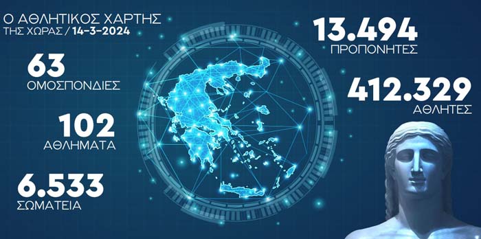 * Στην Ελλάδα, σήμερα, δραστηριοποιούνται 63 Ομοσπονδίες, µε 6.533 σωματεία, σε 102 αθλήματα, µε 13.497 προπονητές και 412. 329 αθλητές.