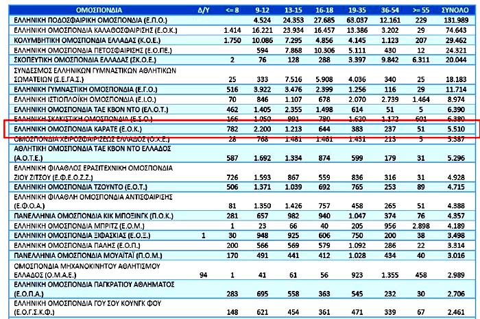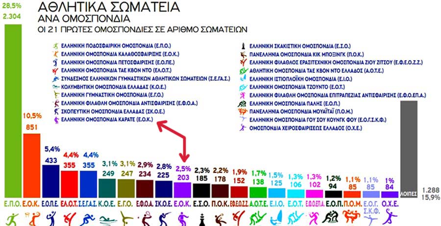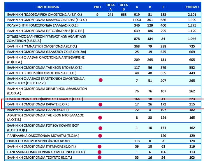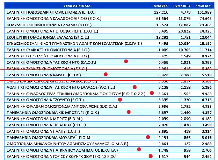 * Η Ελληνική Ποδοσφαιρική Ομοσπονδία διαθέτει τα περισσότερα σωματεία και το μεγαλύτερο ποσοστό (32%) αθλητικού δυναμικού µε 131.989 αθλητές.