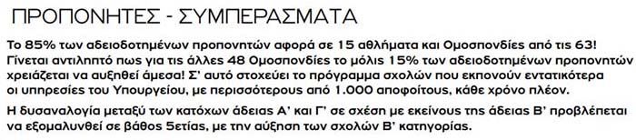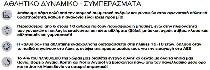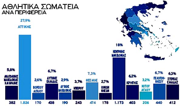 * Η Αττική είναι η περιφέρεια µε το μεγαλύτερο ποσοστό αθλητικού δυναμικού (34,6%) και η Δυτική Μακεδονία µε το μικρότερο ποσοστό (2,1%), ενώ την ίδια στιγμή η περιφέρεια µε μεγαλύτερο ποσοστό αθλητικού δυναμικού ανά πληθυσμό είναι η Περιφέρεια Ιονίων Νήσων µε 4,59%!