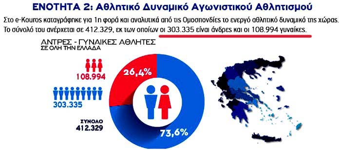 * Το ποσοστό των αθλητριών µε δελτίο στα πιστοποιημένα σωματεία είναι κατά πολύ χαμηλότερο από αυτό των ανδρών, 26,4% έναντι 73,6% αντίστοιχα.