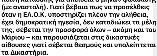 «……. Γιατί βέβαια πως να προσέλθεις όταν η ΕΛ.Ο.Κ. υποστηρίζει πλέον την αλήθεια, έχει δημοκρατική ηγεσία, δεν καταδιώκει τα μέλη της, σέβεται την προσφορά όλων – ακόμη και του Μάριου – και παρουσιάζεται στις δικαστικές αίθουσες γιατί σέβεται θεσμούς και υπολείπτεται τα Δικαστήρια….»