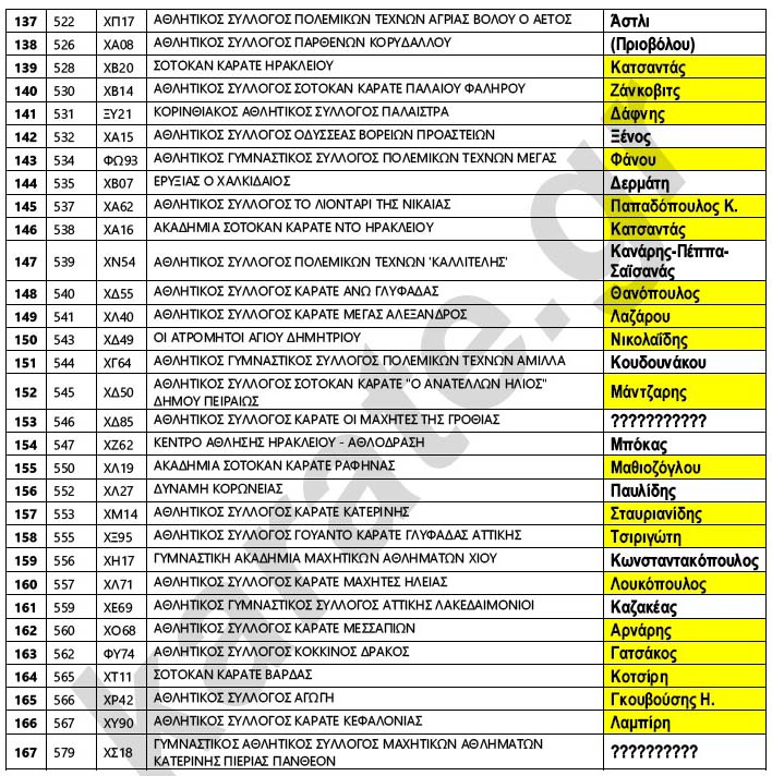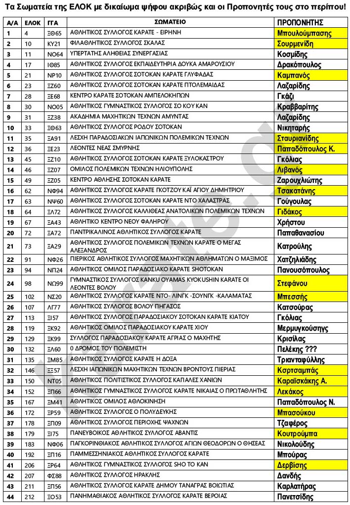 Επαναλαμβάνουμε εδώ τον Πίνακα των 167 Δικαιουμένων Ψήφου Σωματείων με Σημειωμένους τους Υποψήφιους Προπονητές που φοιτούν στη Σχολή, ο οποίος πρόκυψε από το ανωτέρω Πρακτικό ΔΣ της 14/9/2024 και όπου στους 167 συλλόγους με δικαίωμα ψήφου σε περισσότερους από τους 80-90 από αυτούς (με κίτρινο στον πίνακα) ήδη ελέγχονται και χειραγωγούνται οι ψήφοι τους από το ΔΣ της ΕΛΟΚ, διότι ελέγχονται και απειλούνται εξόφθαλμα και εσκεμμένα οι προπονητές τους με τη στέρηση του πτυχίου του προπονητή Β΄ Κατηγορίας, αν δεν ψηφίσουν οι σύλλογοί τους το υπάρχον εγκληματικό ΔΣ! Η δε πρόθεση, οργάνωση του εκβιασμού και απειλή είναι αυταπόδεικτα, εφόσον η Σχολή από τη διάρκεια του ενός εξαμήνου βάσει της Υπουργικής Απόφασης επεκτάθηκε χωρίς κανένα λόγο και μόνο μετά από επιμονή του ΔΣ/ΕΛΟΚ μέχρι μετά τις εκλογές της ΕΛΟΚ! Δεν υπάρχει καμιά αμφιβολία ότι το εγκληματικό σημερινό "ΔΣ της ΕΛΟΚ και Σ(υμμορ)ία" σκέφθηκε και έβαλε σε εφαρμογή αυτή την κομπίνα για να ξαναβγεί στις εκλογές, να κρύψει τις εγκληματικές του πράξεις και να συνεχίσει την "καριέρα του" με επόμενες!!!