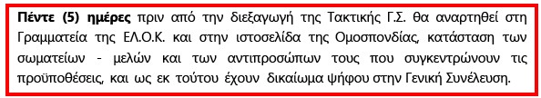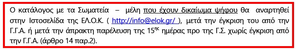 4 - Ο Κατάλογος των σωματείων με δικαίωμα ψήφου θα αναρτηθεί πέντε ημέρες πριν από τη ΓΣ στο site της ΕΛΟΚ! Αλλά για τον Κατάλογο αυτόν ελέγχουν α) η ΕΛΟΚ (δηλαδή ο Μητρόπουλος!) τους αθλητές στους αγώνες της των σωματείων, και β) η ΓΓΑ (δηλαδή ο Καραστάθης!) τις προϋποθέσεις νομιμότητας των σωματείων! Συνεπώς ο Κατάλογος διαμορφώνεται εν αγνοία των σωματείων από δύο Μαφιόζους της; ίδιας Συμμορίας!!!