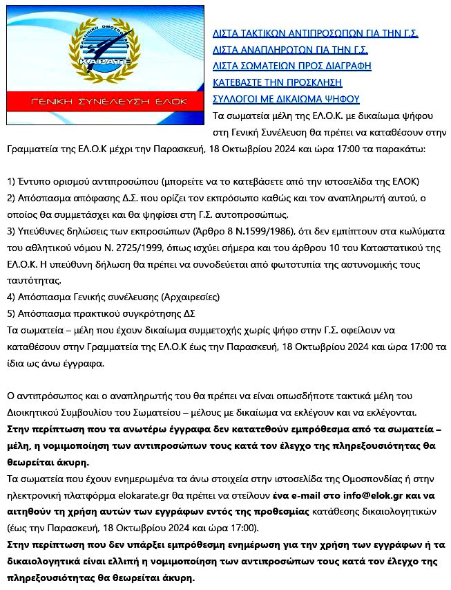 Με αίσθημα ευθύνης απέναντι στα μέλη της κοινότητας του ελληνικού καράτε, εκφράζουμε την έντονη δυσαρέσκειά μας για την απόφαση της Διοίκησης της Ομοσπονδίας να εμμένει στην διεξαγωγή των συνεδριάσεων της Γενικής Συνέλευσης μέσω τηλεδιάσκεψης!
