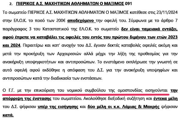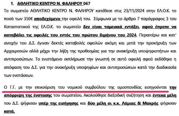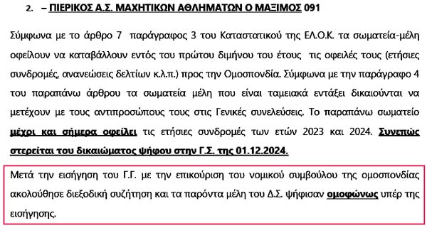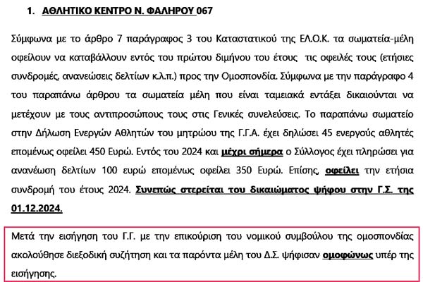 Α. Αποφάσισε ότι το 1ο εξ ημών σωματείο στερείται του δικαιώματος ψήφου στην Γ.Σ. με το πρόσχημα της ύπαρξη ταμειακών οφειλών προς την ΕΛΟΚ και ειδικότερα με την αιτιολογία ότι «Σύμφωνα με το άρθρο 7 παράγραφος 3 του Καταστατικού της ΕΛ.Ο.Κ. τα σωματεία-μέλη οφείλουν να καταβάλλουν εντός του πρώτου διμήνου του έτους τις οφειλές τους (ετήσιες συνδρομές, ανανεώσεις δελτίων κ.λ.π.) προς την Ομοσπονδία. Σύμφωνα με την παράγραφο 4 του παραπάνω άρθρου τα σωματεία μέλη που είναι ταμειακά εντάξει δικαιούνται να μετέχουν με τους αντιπροσώπους τους στις Γενικές συνελεύσεις. Το παραπάνω σωματείο μέχρι και σήμερα οφείλει τις ετήσιες συνδρομές των ετών 2023 και 2024. Συνεπώς στερείται του δικαιώματος ψήφου στην Γ.Σ. της 01.12.2024»