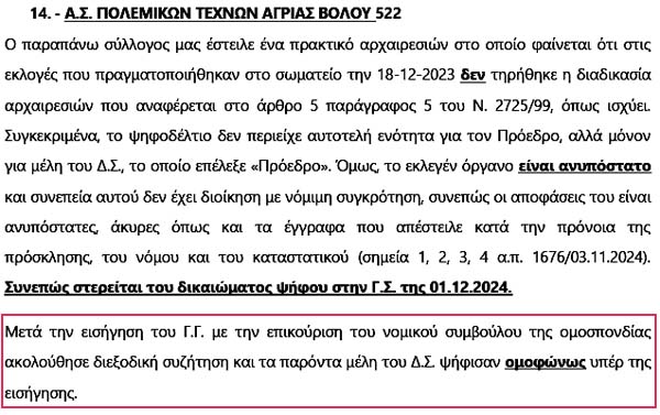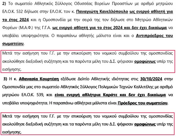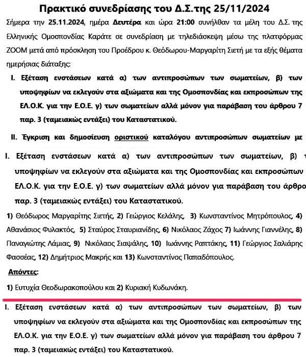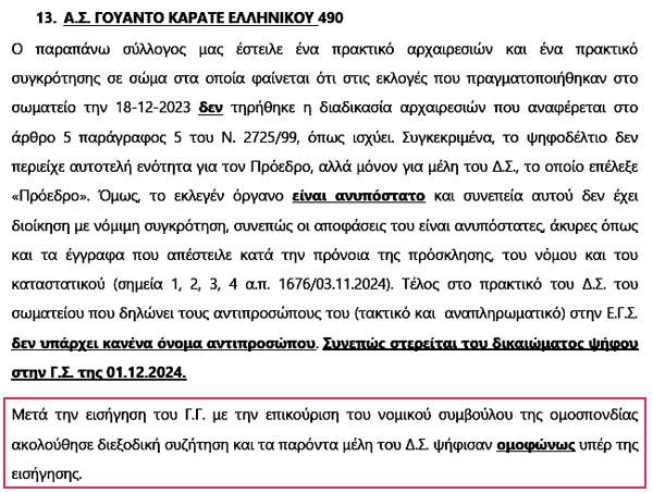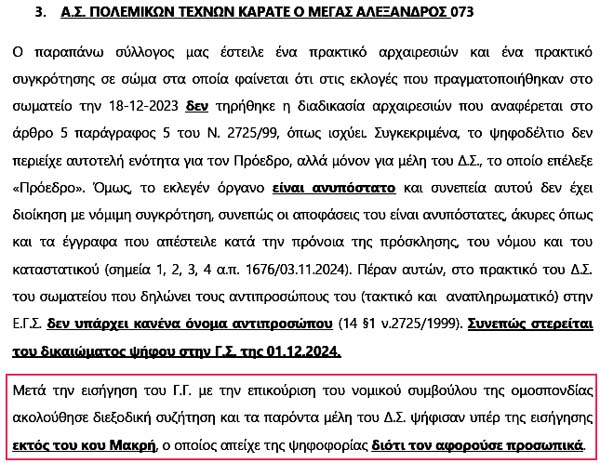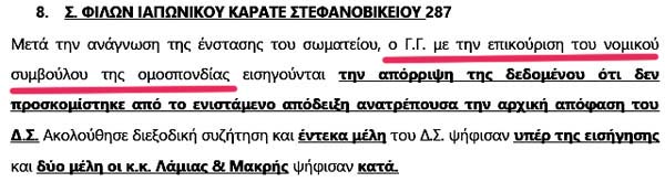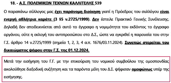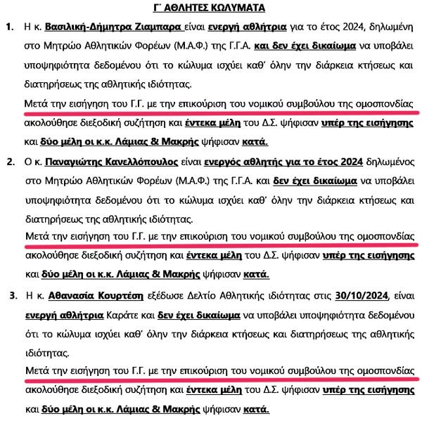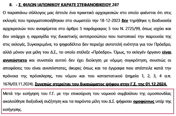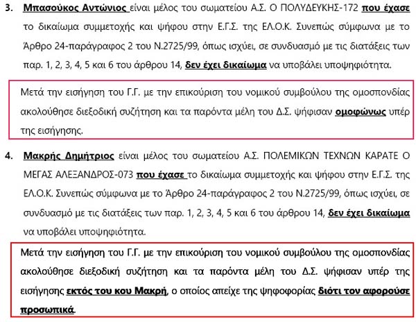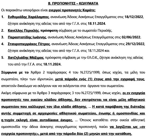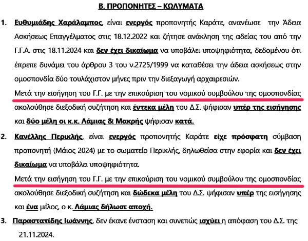 Β. Αποφάσισε ότι δεν έχουμε δικαίωμα συμμετοχής στην Έκτακτη Γενική Συνέλευση οι προτεινόμενο ως αντιπρόσωποι σωματείων 14ος, 15ος και 16ος ημών με την αιτιολογία ότι δήθεν τυγχάνουμε ενεργοί προπονητές καράτε κι επομένως συντρέχει στο πρόσωπό μας κώλυμα εκλογιμότητας κατ’ εφαρμογή του άρθρου 3 παράγραφος 3 του Ν.2725/1999, όπως αυτό ισχύει σύμφωνα με το οποίο: «οι εν ενεργεία προπονητές του οικείου κλάδου άθλησης, δεν επιτρέπεται να είναι μέλη αθλητικού σωματείου που καλλιεργεί τον ίδιο κλάδο άθλησης. … Η κατά παράβαση της διάταξης αυτής συμμετοχή σε αρχαιρεσίες αθλητικού σωματείου, ένωσης ή ομοσπονδίας και η τυχόν εκλογή είναι αυτοδίκαια άκυρες. … Όποιος καταθέτει στην οικεία αθλητική ομοσπονδία την άδεια άσκησης επαγγέλματος προπονητή, παύει να λογίζεται ως «εν ενεργεία προπονητής», μετά από την πάροδο δύο (2) μηνών από την κατάθεση.»