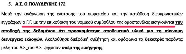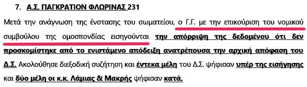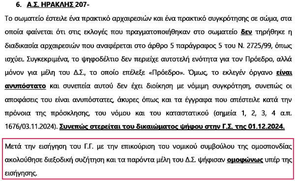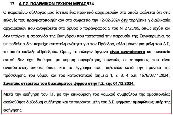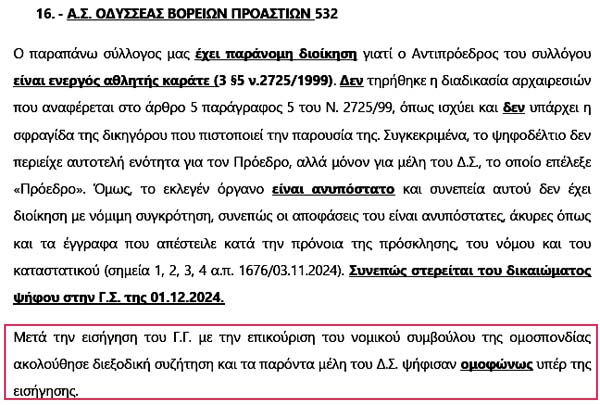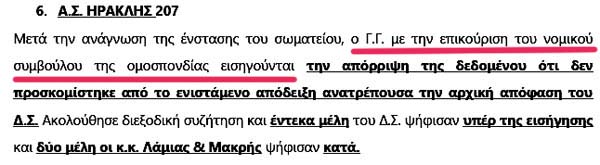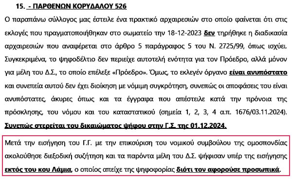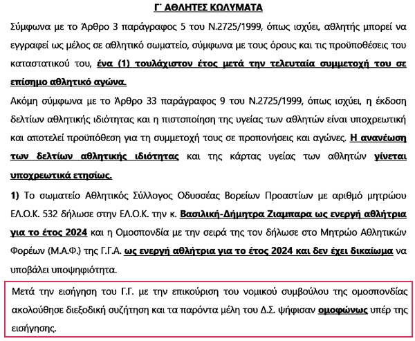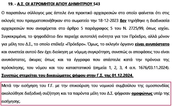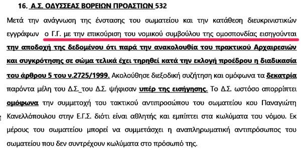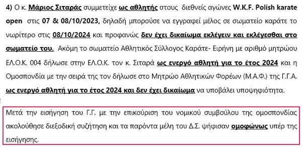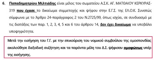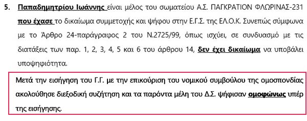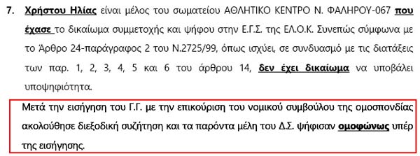 Γ. Αποφάσισε ότι δεν έχουμε δικαίωμα συμμετοχής στην Έκτακτη Γενική Συνέλευση οι προτεινόμενοι ως υποψήφιοι 17η, 18ος και 19ος εξ ημών εκ των οποίων μάλιστα ο τελευταίος Μάριος Σιταράς είμαι υποψήφιος Πρόεδρος. Ο αποκλεισμός μας έγινε κατ’ επίκληση του άρθρου 3 παράγραφος 5 του Ν.2725/1999 σύμφωνα με το οποίο: «αθλητής μπορεί να εγγραφεί ως μέλος σε αθλητικό σωματείο, σύμφωνα με τους όρους και τις προϋποθέσεις του καταστατικού του, ένα (1) τουλάχιστον έτος μετά την τελευταία συμμετοχή του σε επίσημο αθλητικό αγώνα.».