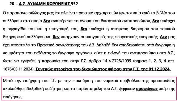 Σχόλιο-2: Είναι άκυρη και παράνομη η ανωτέρω Πρόσκληση για ΓΣ διενέργειας εκλογών ΚΑΙ επειδή ορίζει την διαδικασία ψήφισης ΜΟΝΟ με φυσική παρουσία των αντιπροσώπων των συλλόγων χωρίς να αποδέχεται και την ταυτόχρονη ηλεκτρονική ψηφοφορία, όπως ρητά ορίζει ο νόμος! Και αυτό αποτελεί τον δεύτερο καραμπινάτο λόγο ακύρωσης και της Πρόσκλησης και της Γενικής Συνέλευσης! Και ιδού συγκεκριμένη και καραμπινάτη απόδειξη της ακυρότητας σε πρόσφατη δικαστική απόφαση για τεράστιο σωματείο Α΄ Βαθμού: