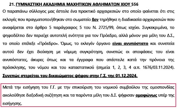 Σχόλιο-1: Είναι άθλιο, παράνομο και αποτελεί κατάφωρη προσπάθεια ΑΙΦΝΙΔΙΑΣΜΟΥ ΚΑΙ ΧΕΙΡΑΓΩΓΗΣΗΣ να συγκαλείται ΕΚΤΑΚΤΗ Γενική Συνέλευση για Αρχαιρεσίες σε αθλητική ομοσπονδία σε 27 ημέρες από την Πρόσκληση και ΟΧΙ ΤΑΚΤΙΚΗ ΣΕ 45 ημέρες από την Πρόσκληση!!! Γιατί ΕΚΤΑΚΤΗ, αφού από την ημέρα που ανέλαβαν στις 30/5/2021 γνώριζαν οι Μαφιόζοι, που διοικούν την ΕΛΟΚ, ότι στο τέλος του Ολυμπιακού έτους 2024 θα έπρεπε να γίνουν βάσει του αθλητικού νόμου οι εκλογές για ΔΣ κτλ. Η ΓΣ για τις Εκλογές της ΕΛΟΚ βάσει του νόμου θα έπρεπε να είναι ΤΑΚΤΙΚΗ και οι σύλλογοι, όπως και οι επιθυμούντες θα θέσουν υποψηφιότητες, θα έπρεπε να έχουν 45 ημέρες να προετοιμαστούν! Αυτή η καραμπινάτη προσπάθεια ΑΙΦΝΙΔΙΑΣΜΟΥ ΚΑΙ ΧΕΙΡΑΓΩΓΗΣΗΣ των υποψηφιοτήτων και των αποτελεσμάτων των εκλογών από τους Μαφιόζους, που διοικούν, και τον δικηγόρο τους αποτελεί έναν πρώτο καραμπινάτο λόγο ακύρωσης και της Πρόσκλησης πριν από την 1/12/2024 και της Γενικής Συνέλευσης μετά την 1/12/2024!