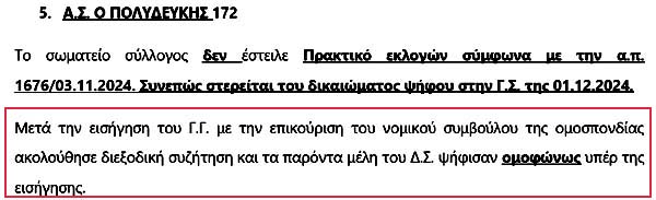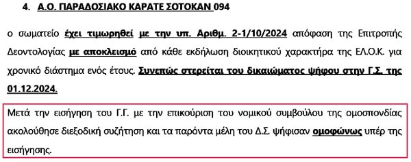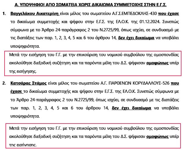 Α. Αποφάσισε ότι δεν έχουν δικαίωμα συμμετοχής στην Έκτακτη Γενική Συνέλευση όλοι οι αντιπρόσωποι που είχαν προταθεί από σωματεία που έχασαν το δικαίωμα συμμετοχής και ψήφου στην Ε.Γ.Σ. της ΕΛ.Ο.Κ. της 01.12.2024. Ωσαύτως το ΔΣ της ΕΛΟΚ με την απόφασή του αφαίρεσε το δικαίωμα συμμετοχή στην ΕΛΟΚ από τους 10η, 11ο , 12ο και 13ο εξ ημών που όλοι ως μελών του ΔΣ και προτεινομένων αντιπροσώπων των αντίστοιχων σωματείων ως προς τα οποία το ΔΣ είχε παρανόμως κρίνει ότι δεν έχουν δικαίωμα συμμετοχής στην ΓΣ και ψήφου στις αρχαιρεσίες.