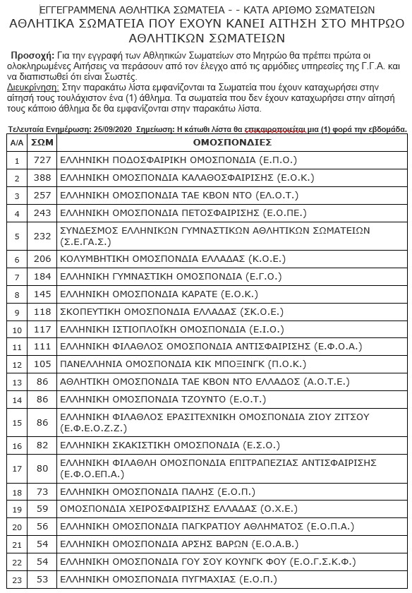 Σας δίνω με κλικ εδώ τον πίνακα της ΓΓΑ την 25-9-2020 με τις ομοσπονδίες κατά αλφαβητική σειρά και τα σωματεία-μέλη τους με σύνολο 4.149! (Με κλικ στο όνομα κάθε ομοσπονδίας ανοίγει το pdf με τα σωματεία της!)