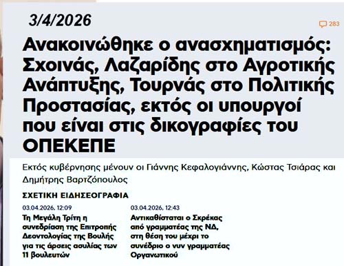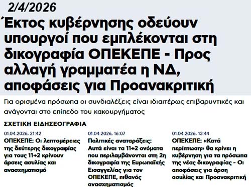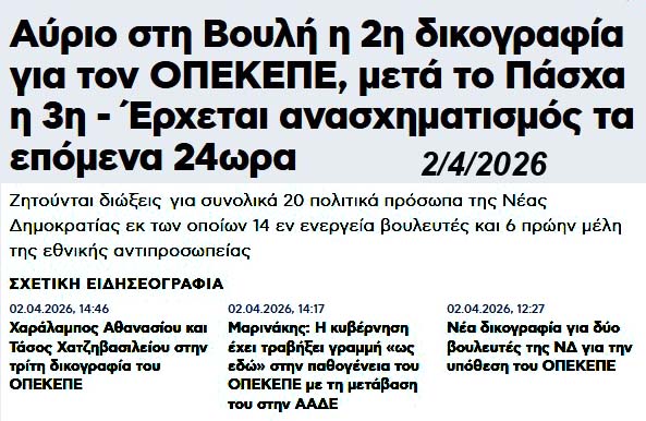 4/4/2026 - Η Δικογραφία ΟΠΕΚΕΠΕ-2 από την Ευρωπαϊκή Εισαγγελία και η Υπουργός Εργασίας Νίκη Κεραμέως στο ΚΑΛΗΜΕΡΑ της Φαίης Μαυραγάνη στον SKAI με απογμαγνητοφώνηση των διαλόγων και ταυτόχρονα δημοσιεύματα των εφημερίδων τις ίδιες ημέρες: