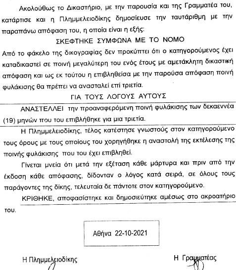 Και τελικά το Δικαστήριο ανακοίνωσε την Απόφασή του, που ήταν ίδια με την πρόταση της κας Εισαγγελέως με την πρόσθετη παρατήρηση ότι η μνήμη του μάρτυρα Χονδροματίδη ήταν πιο φρέσκια και αξιόπιστη κατά την ένορκη βεβαίωση την 18/2/2015 παρά κατά την κατάθεσή του στην Πρώτη Δίκη την 22/10/2021! Και η Απόφαση είναι η επόμενη σε απόσπασμα: