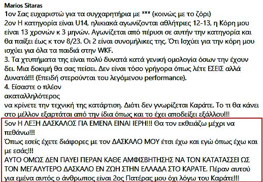 Το σημείο σύγκρουσής μας ήταν το ότι την 16/7/2017 έδωσε, και το δημοσίευσε ανωτέρω, μπροστά στους μαθητές του (δηλαδή στον ... εαυτό του) ο ίδιος εξετάσεις για έκτο Νταν και το κατέκτησε ... επάξια!!! Πού έχει ακουστεί αυτό σε οποιονδήποτε τομέα της ζωής, της παιδείας, της τεχνικής και της επιστήμης να δίνει κανένας εξετάσεις στον εαυτό του ??? Τη μήνυση την κέρδισα και για την αγωγή λίγη υπομονή!