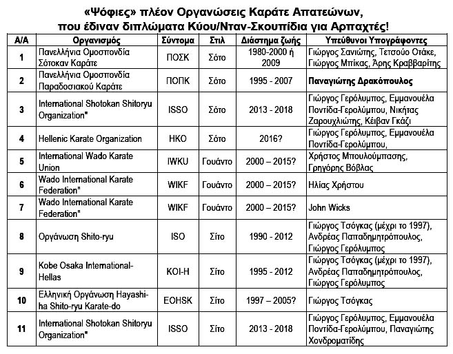 Ας δούμε, λοιπόν, εδώ ενδεικτικά τις είκοσι επτά (29) παρα-ομοσπονδίες των ... ΦΑΡΑΩ του Καράτε με τις Πυραμίδες Απάτης για Νταν-Μαϊμούδες, που αποτελούν καρκίνωμα για το ελληνικό καράτε! Η κάθε μια δίνει τα δικά της Κύου και Νταν χωρίς να αναγνωρίζει τα Κύου και Νταν της άλλης! Ένας κόσμος Ηλιθίων Απατεώνων, που έχει καταστρέψει το ελληνικό καράτε!