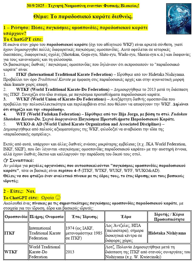 Α - Τεχνητή Νοημοσύνη εναντίον Φυσικής Βλακείας! Θέμα: Το Παραδοσιακό Καράτε διεθνώς. (Ενότητες)