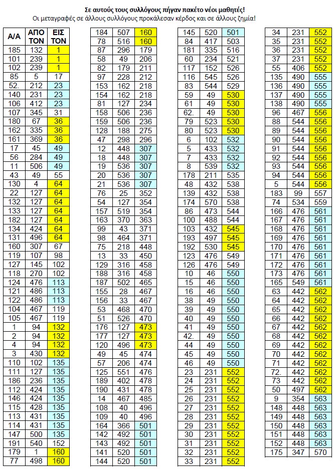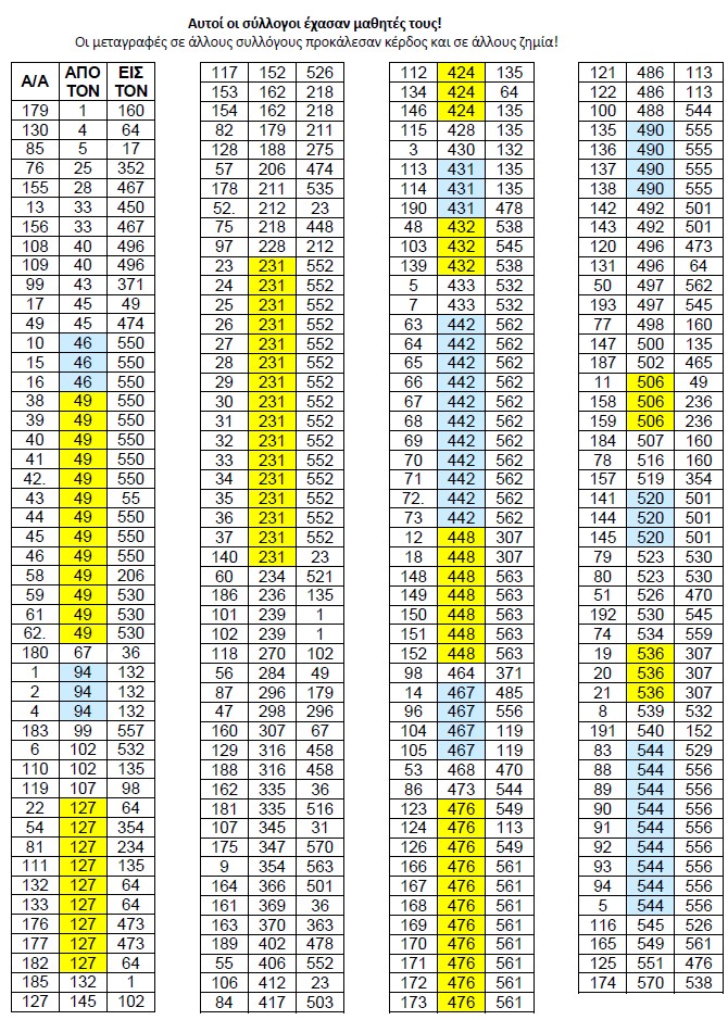 Στα μέσα Σεπτεμβρίου οριστικοποιήθηκαν οι Μεταγραφές των αθλητών από σύλλογο σε σύλλογο για λόγους, που φαίνονται στον Πίνακα Μεταγραφών. Αυτό είναι ένα θέμα που κανένας δεν το προσέχει αν γίνεται σύννομα. Δίνουμε τον Πίνακα Μεταγραφών της ΕΛΟΚ με κλικ εδώ, από τον πίνακα αυτόν κρατάμε μόνο τις τρεις στήλες αύξοντα αρίθμού, συλλόγου προέλευσης και συλλόγου κατάληξης. Κατωτέρω δίνουμε σε δύο πίνακες τους αθλητές που μεταγράφηκαν: τον ένα ταξινομημένο κατά τους συλλόγους, που έχασαν αθλητές και τον άλλο ταξινομημένο κατά τους συλλόγους που απέκτησαν νέους αθλητές από τους μεταγραφέντες για να μελετήσετε στον πρώτο ποιοί έχασαν και κυρίως στον δεύτερο ποιοί κέρδισαν!!!